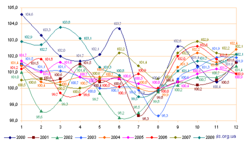Динаміку зміни індексу споживчих цін у 2000–2008 роках показано на графіку 1.1.