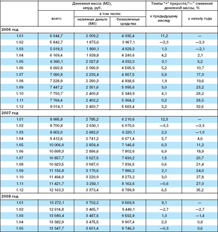 По итогам III квартала 2008г. денежная масса М2 увеличилась на 8,3%, Темпы прироста в годовом выражении снизились с 47,5% на 1.01.2008 до 25,1% на 1.10.2008 (48,3% на 1.10.2007). В январе — сентябре соотношение темпов роста потребительских цен и денежного агрегата М2 обусловило сокращение рублевой денежной массы в реальном выражении на 2,1%, а за аналогичный период 2007г. она увеличилась на 18,7%