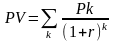 Допустимо, робиться прогноз, що інвестиція (ІC) буде генерувати протягом n років, річні доходи в розмірі P1, P2, ..., Рn. Загальна накопичена величина дисконтуємих доходів (PV) і чистий приведений ефект (NPV) відповідно розраховуються по формулах: