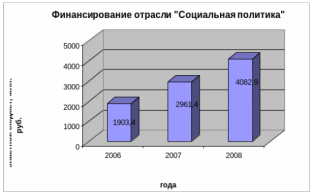 Около 500 тыс. граждан, проживающих в области, получают различные меры социальной поддержки и социальные услуги (40% населения области), среди них самыми многочисленными категориями являются люди пожилого возраста, инвалиды, семьи с детьми. Динамика финансирования данной отрасли из областного бюджета показана на диаграмме 2. Отсюда следует, что финансирование отрасли "Социальная политика" за 2008 г. возросло по сравнению с 2006 г. на 114,5%.