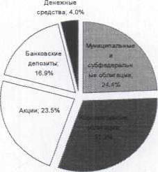 Объем инвестиционного портфеля СПН в 2007 году увеличился более чем на 620 млн. руб. Структура инвестиционного портфеля в течение года радикально не изменялась и формировалась в соответствии с умеренно-консервативной стратегией, предполагающей доминирующую долю облигаций и банковских депозитов. На конец 2007 года в акции было вложено около 23,5% активов, в субфедеральные и муниципальные облигации - 24,4%, в корпоративные облигации - около 31,2%, на депозитах в банках находилось 16,9% активов, свободные денежные средства составляли порядка 4%.