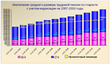 На 2007-2009 годы Правительством Российской Федерации рассматривается возможность доведения базовой части трудовой пенсии до прожиточного минимума, что приведет к существенному увеличению пенсионных выплат. Приводим динамику роста трудовых пенсий на 2007-2010 годы.