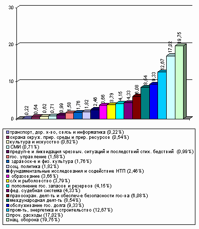 По рис.2.9 видно, что в 1995 году основным пунктом расходов государства являлась национальная оборона, т.к. из-за потери территорий страна должна была уделять больше внимания защите своих граждан. А самые незначительные траты были направлены на транспорт, связь, охрану окружающей среды, культуры и СМИ, о чем можно судить, что резко упало социальное обеспечение населения.