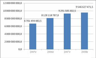 Рис. 2.12 уровень бюджетных ассигнований за 2005-2008 гг.