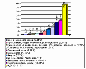 На основании рис.2.10 мы видим, что, как и в начале 90-ых годов, бюджет в современной России в основном формируется за счет налоговых отчислений. Но в то же время из-за того, что экономика нашего государства выросла, и активно экспортируются на запад ресурсы страны, большое значения для бюджета имеют доходы от внешнеэкономической деятельности, они составляют почти 28% от всех поступлений.