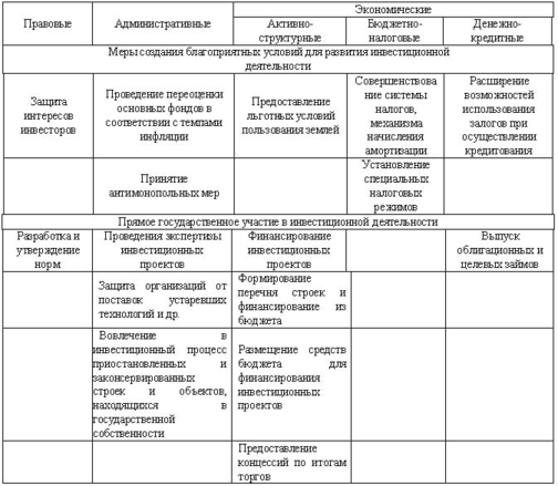 Таблица 1. Инструменты государственного регулирования инвестиционной деятельности
