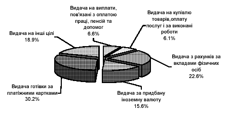 У загальному обсязі видачі готівки з кас банків за 8 місяців поточного року виплати, пов’язані з оплатою праці, пенсій та допомог, становили 6.6%, або були на 1.8 процентного пункту меншими, ніж за аналогічний період торік. Також скоротилася питома вага видачі готівки на купівлю товарів і оплату послуг (на 0.8 процентного пункту до 6.1%) та за придбану іноземну валюту (на 2.4 процентного пункту до 15.6%).