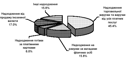 Основним джерелом надходження готівки до кас банків залишалася торговельна мережа - 36.9%, однак порівняно з аналогічним періодом попереднього року її частка скоротилася на 3.6 процентного пункту. Також зменшилася питома вага надходжень виручки від усіх видів платних по слуг (з 12.5 до 11.8%) та від продажу іноземної валюти (з 19.6 до 17.7%).