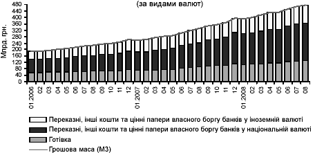 За станом на 01.09.2008 р. загальний обсяг грошової маси в обігу дорівнював 474.9 млрд. грн. і збільшився з початку року на 19.9% (за аналогічний період 2007 року - на 26.0%). За січень - серпень поточного року грошова маса в національній валюті збільшилася на 19.0%, в іноземній - на 23.0%
