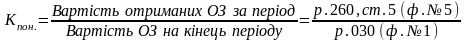 – Коефіцієнт поновлення основних засобів (Кпон.) – визначає частину нових основних засобів на кінець звітного періоду в складі основних засобів: