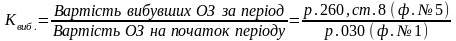 – Коефіцієнт вибуття (Квиб.) – показує, яка частина ОЗ, з якими підприємство почало свою діяльність в звітному періоді, вибула з різних причин: