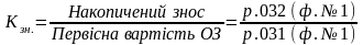 – Коефіцієнт зношування основних засобів (Кзн.) – характеризує частку вартості основних засобів, яка була списана на витрати в попередніх періодах, в первісній вартості. Доповненням цього показника до 100 % (або одиниці) є коефіцієнт придатності основних засобів (Кпр.):