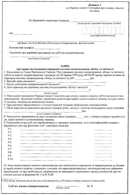 Для переходу фізичної особи на сплату єдиного податку вона повинна отримати свідоцтво платника єдиного податку за місцем її державної реєстрації. Ставки єдиного податку встановлюються місцевими органами влади і залежать від виду діяльності, зацікавленості цих органів у її розвитку, стану інфраструктури підприємництва й інше. Якщо на малому підприємстві, платником єдиного податку якого є фізична особа без утворення юридичної особи і на ньому працює більш ніж 10 робітників, то в цьому випадку ставка єдиного податку збільшується на 50% на кожну додатково працюючу особу.