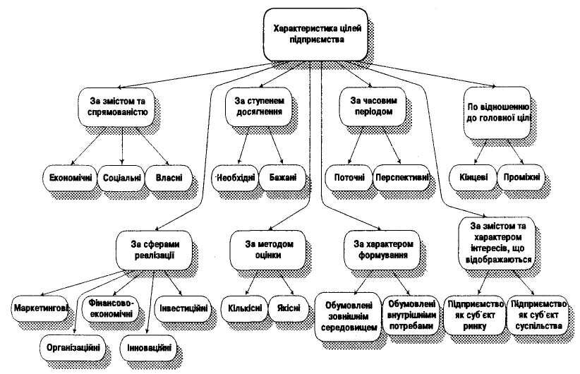 1. Залежно від змісту та направленості цілей розрізняють: економічні цілі - зниження витрат, підвищення рентабельності, нарощування капіталу, досягнення цільового прибутку, вихід на нові ринки або розширення ринків збуту, підвищення ринкової вартості підприємства та інше; соціальні - створення нових робочих місць, матеріальна підтримка малозабезпечених верств населення, соціальна допомога робітникам та інше; власні - досягнення економічної влади, іміджу, збереження сімейних традицій та інше.