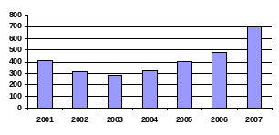 Малюнок 2.2 - Виробництво кондитерських виробів на Україні 2001 - 2007 р. (тис. тонн).