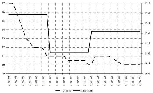 Как уже отмечалось, за последние несколько лет Республика Беларусь добилась значительных успехов в снижении уровня инфляции. Это стало возможным благодаря устойчивому экономическому росту наряду с проводимой жесткой денежно-кредитной политикой. В 2005 г. в Республике Беларусь был принят ряд мер по сдерживанию роста цен, и, прежде всего на основные социально значимые товары и услуги. За 2005 г. уровень инфляции составил 12,95%. В области снижения инфляции выработана и последовательно проводится система сдерживания необоснованного роста цен и их упорядочения в отдельных отраслях. Государство регулирует цены и тарифы как на важнейшие социально значимые товары и услуги, так и на товары, оказывающие влияние на уровень цен в других отраслях. В результате принятых мер инфляция снизилась с 12,95% в 2005 г. до 11,03% в 2006 г. По итогам 2007 года уровень инфляции составил 12,1%, в два раза превысив прогноз. Прогнозируемый уровень инфляции на 2008 г. составляет 10,6-10,8%. Такой уровень инфляции является основой для обеспечения макроэкономической стабильности и повышения уровня жизни населения. Но, как показывают данные статистики, уровень инфляции уже за 8 месяцев превысил прогнозное значение на год. Анализ данных за 2003-2007 годы показал, что ставка рефинансирования и объемы денежной массы не влияют на инфляцию. Таким образом, можно сделать вывод, что в переходной экономике, какой является экономика Беларуси, ставка рефинансирования как инструмент денежно-кредитной политики является неэффективной с точки зрения влияния на инфляционные процессы. Инфляция сдерживается за счет такого инструмента, как операции на открытом рынке и других инструментов, не имеющих отношения к денежно-кредитной политике.