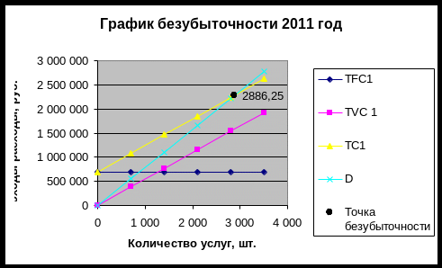 Для построения Графика безубыточности можно использовать любой табличный процессор, например Excel (пакет прикладных программ MS Office). Чтобы найти точку безубыточности необходимо на одном графике изобразить четыре прямые – постоянных затрат, переменных затрат, совокупных затрат, выручки от реализации.