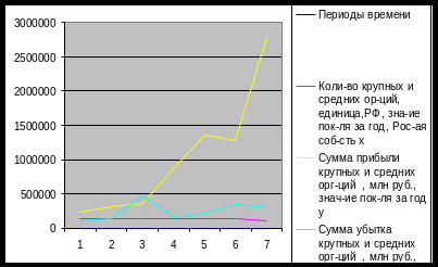 На основе графического анализа можно сделать вывод о том, что сумма прибыли крупных и средних организаций резко растут вплоть до 2010 года, а убытки крупных и средних организаций и число крупных и средних организаций постепенно падают, который на прямую зависит от прибыли и убытков организации.
