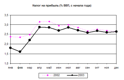 Во второй половине 2003 года началось сокращение разрыва в поступлениях по налогу прибыль в процентах ВВП по сравнению с предыдущим годом. По итогам прошлого года эти поступления вышли на уровень 2002 года. Вместе с тем нельзя забывать, что региональная ставка налога на прибыль в 2003 году была увеличена на 1,5 процентного пункта за счёт сокращения федеральной ставки.