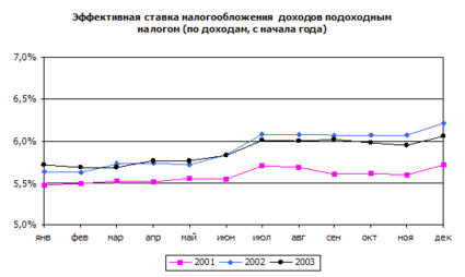 Рост поступлений по подоходному налогу был обусловлен в 2003 году опережающим ростом доходов населения, приведшим к их увеличению по отношению к ВВП на 3,6 процентных пункта по сравнению с 2002 годом. Положительный эффект на сборы подоходного налога от выхода части заработной платы из тени исчерпался в 2002 году. В пользу этого заключения свидетельствует тот факт, что эффективная ставка налогообложения доходов населения подоходным налогом, определяемая как отношение сборов этого налога к объёму налогооблагаемых доходов населения или к зарплате в экономике, осталась практически на уровне 2002 года с незначительным снижением во второй половине 2003 года.