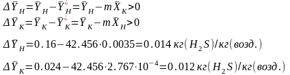 - начальная и конечная концентрация сероводорода в газе,
