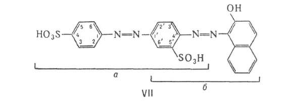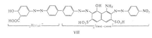 Во многих дис- и полиазокрасителях цепь сопряжения разорвана, например, как в красителях типа ArN=NAr'—X— —Ar"N=N—Аг'", где X = О, S, CH2, CONH и т.п. или отсутствует (поворот Аr' и Аr" делает молекулу неплоской). Части молекулы, разделенные фрагментом X, поглощают свет независимо друг от друга. Цвет таких красителей приблизительно соответствует цвету смеси азокрасителей, которые могли бы образоваться при разрыве молекулы по X. Например, полиазокраситель VIII окрашен в зелёный цвет, соответствующий смеси составляющих его жёлтого моноазокрасителя и тёмно-синего дисазокрасителя.