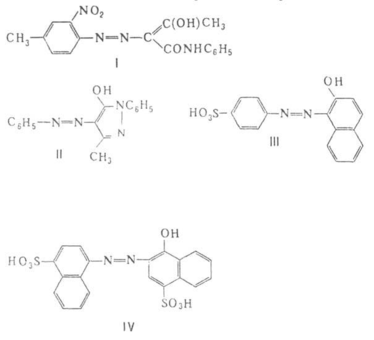 электронной сопряженной системы), числом и положением в них заместителей. Наиболее практически важные моноазокрасители, содержащие один электронодонорный заместитель, имеют следующие цвета: желтый -производные бензолазоацетоацетарилидов, пиразолоназобензола и азобензола, например, пигмент желтый светопрочный формула I), жирорастворимый желтый 3 (II); оранжевый и красный -производные соответственно нафталиназобензола и азонафталина, например кислотный оранжевый (III) и кислотный красный 2С (IV). Углубление цвета достигается увеличением
