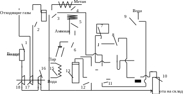1 – фильтр воздуха; 2 – реактор каталитической очистки; 3 – топочное устройство; 4 – подогреватель метана; 5 – подогреватель аммиака; 6 – смеситель аммиака и воздуха с пролитовым фильтром; 7 – холодильник-конденсатор; 8 – сепаратор; 9 – абсорбционная колонна; 10 – продувочная колонна; 11 – подогреватель отходящих газов; 12 – подогреватель воздуха; 13 – сосуд для окисления нитрозных газов; 14 – контактный аппарат; 15 – котел‑утилизатор; 16,18 – двухступенчатый турбокомпрессор; 17 – газовая турбина
