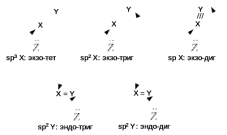 Система номенклатуры для описания возможных типов циклизаций проиллюстрирована на рис. 5. Она определяется характером гибридизации атома, атакуемого нуклеофилом, и тем, происходит ли сдвиг электронов от нуклеофильного центра к эндоциклическому (эндо) или экзоциклическому (экзо) атому.