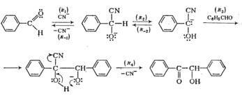 При действии водно-спиртовых растворов цианида калия арилальдегиды димеризуются в α-оксикетоны. Из бензальдегида образуется бензоин.