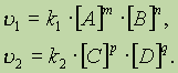 согласно закону действующих масс, скорости прямой реакции v1 и обратной v2 соответственно запишутся следующим образом: