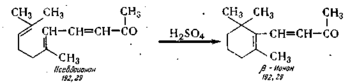 β-Ионон — желтоватая маслянистая жидкость, температура кипения 118—120°С при остаточном давлении 5 мм рт. ст. и 132° С при остаточном давлении 12 мм рт. ст., С13Н2оО, молекулярная масса 192,29; по =1,5210; хорошо растворим в органических растворителях, плохо в воде; Xmах= 296 нм, E=557.
