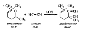 Дегидролиналоол (3,7-диметилоктаен-6-ин-1-ол-3). Дегидролиналоол синтезируют по следующей химической реакции: