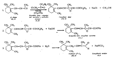 Синтез альдегида С14 осуществляют по реакции Дарзана путем конденсации (3-ионона с метиловым или этиловым эфиром монохлоруксусной кислоты в присутствии метилата натрия. Реакции протекают по следующей схеме:
