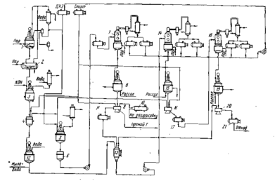 Декарбоксилирование. В реактор 21 добавляют воду и дихлорэтан, перемешивают, а затем направляют реакционную массу в делительную воронку 26. Нижний дихлорэтановый слой отделяют в воронке и в смесителе 27 промывают водным раствором поваренной соли, приготовленном в смесителе 28. Нижний слой спускают в смеситель 29, затем добавляют в этот смеситель сульфат натрия и перемешивают. Сухой экстракт переводят в вакуум-перегонный аппарат 30, отгоняют дихлорэтан, а затем под глубоким вакуумом (0,1 мм рт. ст. при температуре около 100° С) отгоняют альдегид С14. При необходимости альдегид подвергают ректификации при остаточном давлении 0,3—0,5 мм рт. ст.