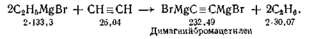 Ацетилен пропускают при температуре 18—20° С до полного исчезновения магний бромэтила, что контролируется реакцией с кетоном Михлера (наличие вызывает изумрудно-зеленое окрашивание). Дегидратацию диола С4о осуществляют в среде сухого серного эфира спиртовым раствором хлористого водорода в присутствии азота. Реакции протекают по следующей схема: