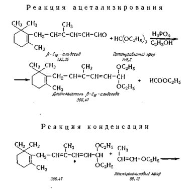 Для успешного протекания реакций ацетализирования и конденсации важно, чтобы влажность реагентов была минимальной (в %): абсолютного спирта — 0,15; этилвинилового эфира — 0,2; ортомуравьиного эфира — 0,09; альдегида-С14 — 0,04. Хлористый цинк предварительно должен быть сплавлен и высушен в вакуум-эксикаторе над концентрированной серной кислотой.