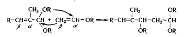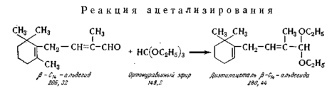Химические реакции получения альдегида С16 заключаются в ацеталировании альдегида-С14, конденсации полученного ацеталя с виниловым эфиром в присутствии хлористого цинка и омыления алкоксиацеталя альдегида С16. Химизм реакций синтеза альдегида С16 основан на склонности виниловых эфиров присоединяться к ацеталям а, (3-непредельных карбонильных соединений, причем одна алкоксигруппа [OR] перемещается от ацеталя к двойной связи винилового эфира. Остаток ацеталя присоединяется к β-углеродному атому винилового эфира. Конденсация и перегруппировка протекает по схеме: