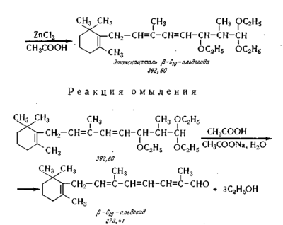 Выход альдегида на диэтилацеталь составляет 55—57% (от теоретического). Альдегид β-С19 представляет собой ярко-желтые ромбические кристаллы с температурой плавления 63—65°С; хорошо растворим в органических растворителях, плохо — в воде; Хтах=325 нм (в спирте).