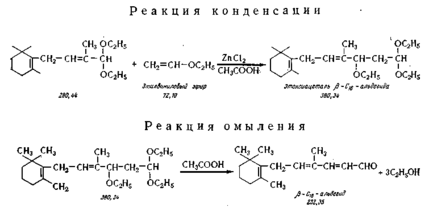 Химические реакции получения альдегида-С19 заключаются в ацетали-зировании альдегида С16, конденсации полученного ацеталя с виниловым эфиром в присутствии хлористого цинка и омыления алкоксиацеталя альдегида С19 по следующей химической схеме.