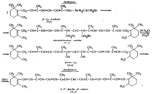 Вещество получают конденсацией альдегида С19 с ацетиленовым комплексом Иоцича с последующей дегидратацией образующегося диола С40. Реакцию конденсации начинают с приготовления реактива Гриньяра, который с ацетиленом в среде сухого эфира дает комплекс Иоцича по схеме: