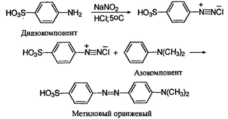 Согласно одной из теорий цветности, окрашенное соединение должно содержать так называемую хромофорную группировку - это может быть, например, пара атомов соединенных двойной связью: ОС, C=N, N=N. Очень полезно присутствие в молекуле так называемой ауксохромной группировки, несущей одну или несколько подвижных электронных пар: при ее наличии цвет вещества углубляется. Пример такой групприровки диметиламиногруппа - N(CH3)2- Вот, к примеру, краситель метиловый оранжевый, очень широко применяемый как индикатор на кислоты. Его получают из сульфаниловой кислоты и К,К-диметиланилина: