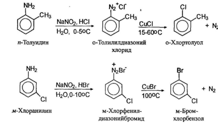 Замещение диазогруппы на хлор и бром осуществляется действием на свежеприготовленный раствор соли диазония хлоридом или бромидом одновалентной меди. Считают, что реакция проходит по радикальному механизму (реакция Зандмеера):