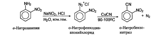 Замещение диазогруппы на нитрильную осуществляется также по реакции Зандмеера использованием цианида одновалентной меди.