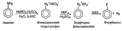 Для замещения диазогруппы на фтор к раствору соли диазония прибавляют тетрафторборную кислоту, при этом осаждается борфториды диазония, которые отфильтровывают, промывают и сушат. При осторожном нагревании борфториды диазония разлагаются с образованием арилфторидов: