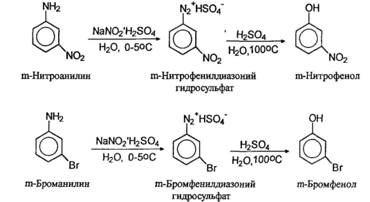 При нагревании водных растворов сульфатов диазониев происходит отщепление азота и образуются фенолы. Таким образом можно получать фенолы с различными заместителями в ароматическом кольце, например: