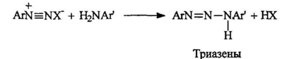 В средах, близких к нейтральной, катионы диазония электрофильно атакуют неподеленную пару электронов азота первичной аминогруппы. Образующиеся при этом аминоазосоединения называют триазенами.