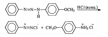 При действии минеральных кислот триазены расщепляются. При этом если триазен несимметричный, расщепление происходит таким образом, что отщепляется амин, являющийся более сильным основанием, а из "азофрагмента" образуется соответствующая соль диазония: