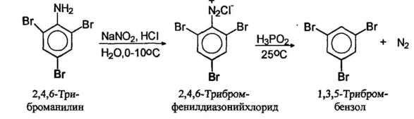 Замещение диазогруппы на водород можно осуществлять с помощью нескольких реагентов. Наиболее широкое применение получила фосфорноватистая (гипофосфористая) кислота. Соли диазония просто оставляют стоять в присутствии фосфорноватистой кислоты. С помощью этой оеакпии удаляют аминогруппу с ароматического кольца.
