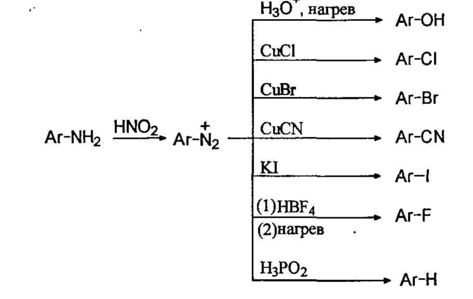 Диазогруппа может быть замещена на разнообразные группы, это является одним из самых лучших путей введения функциональных групп в ароматическое ядро: